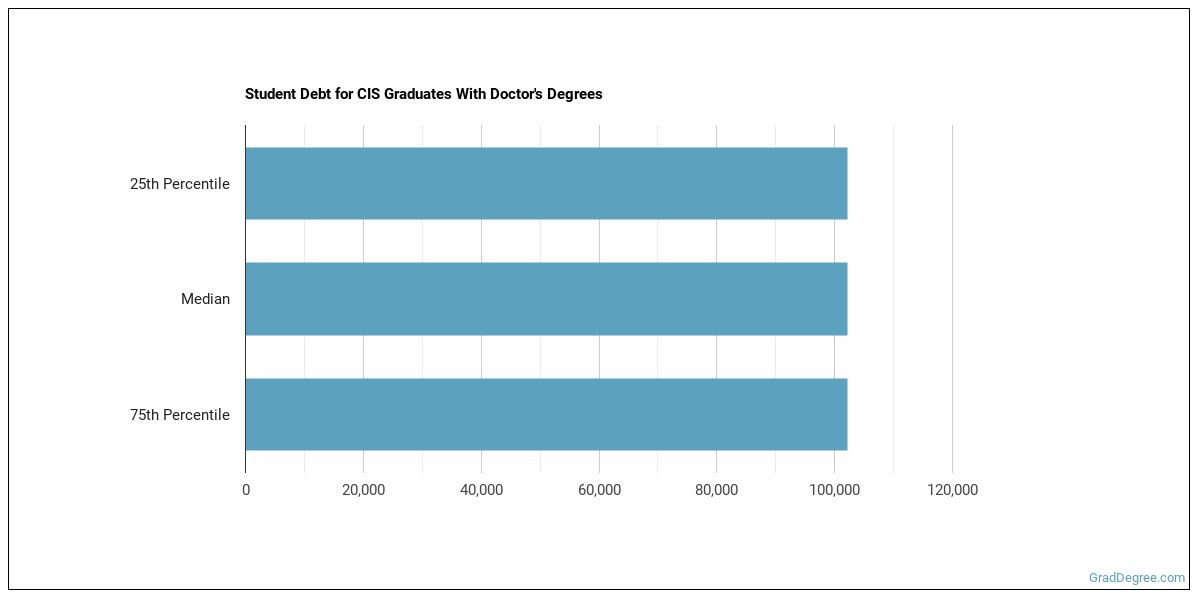 The median student debt for graduates holding a doctor's degree in cis is $98,917. The school you go to and how long it takes you to graduate, among other things, can cause this number to vary. The chart below shows the range of accumulated debt loads. On the high side of the range, $98,917 is the debt load, and the debt load on the low side is $98,917.