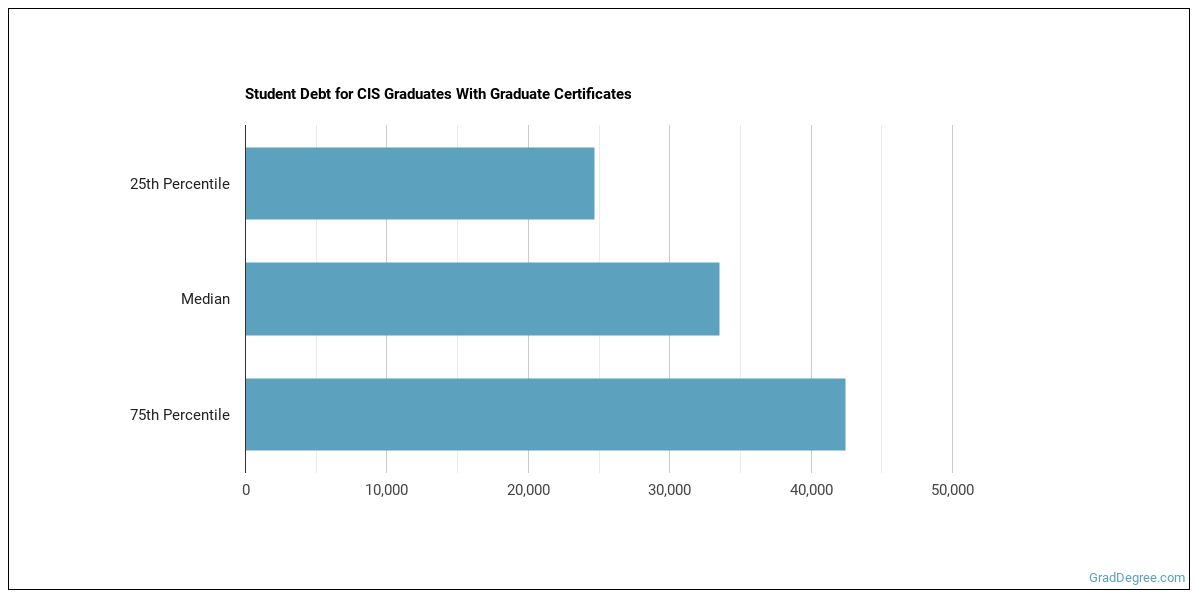 The median student debt for graduates holding a graduate certificate in cis is $38,194. The school you go to and how long it takes you to graduate, among other things, can cause this number to vary. The chart below shows the range of accumulated debt loads. On the high side of the range, $42,340 is the debt load, and the debt load on the low side is $31,286.