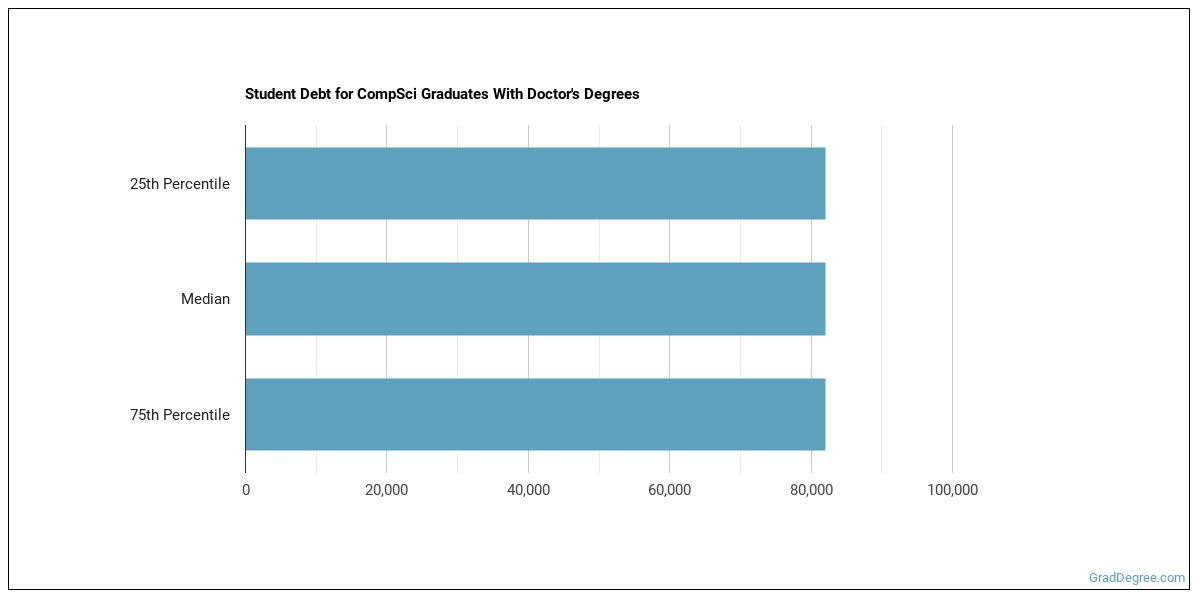 The median student debt for graduates holding a doctor's degree in compsci is $71,834. The school you go to and how long it takes you to graduate, among other things, can cause this number to vary. The chart below shows the range of accumulated debt loads. On the high side of the range, $71,834 is the debt load, and the debt load on the low side is $71,834.