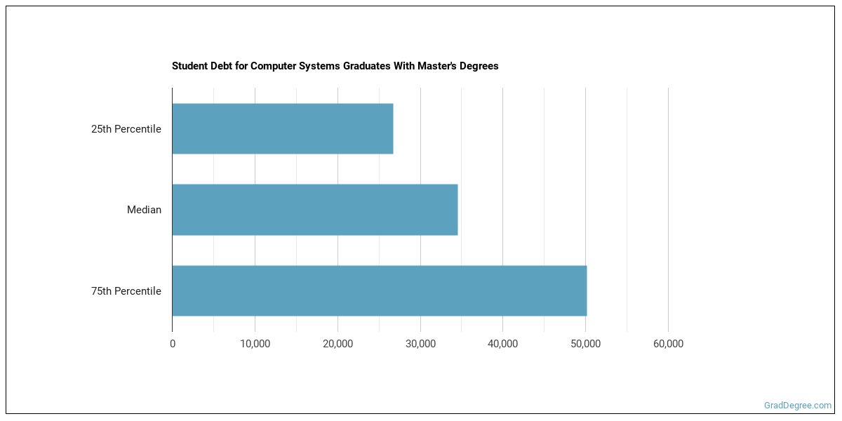 The median student debt for graduates holding a master's degree in computer systems is $29,878. The school you go to and how long it takes you to graduate, among other things, can cause this number to vary. The chart below shows the range of accumulated debt loads. On the high side of the range, $50,444 is the debt load, and the debt load on the low side is $23,317.