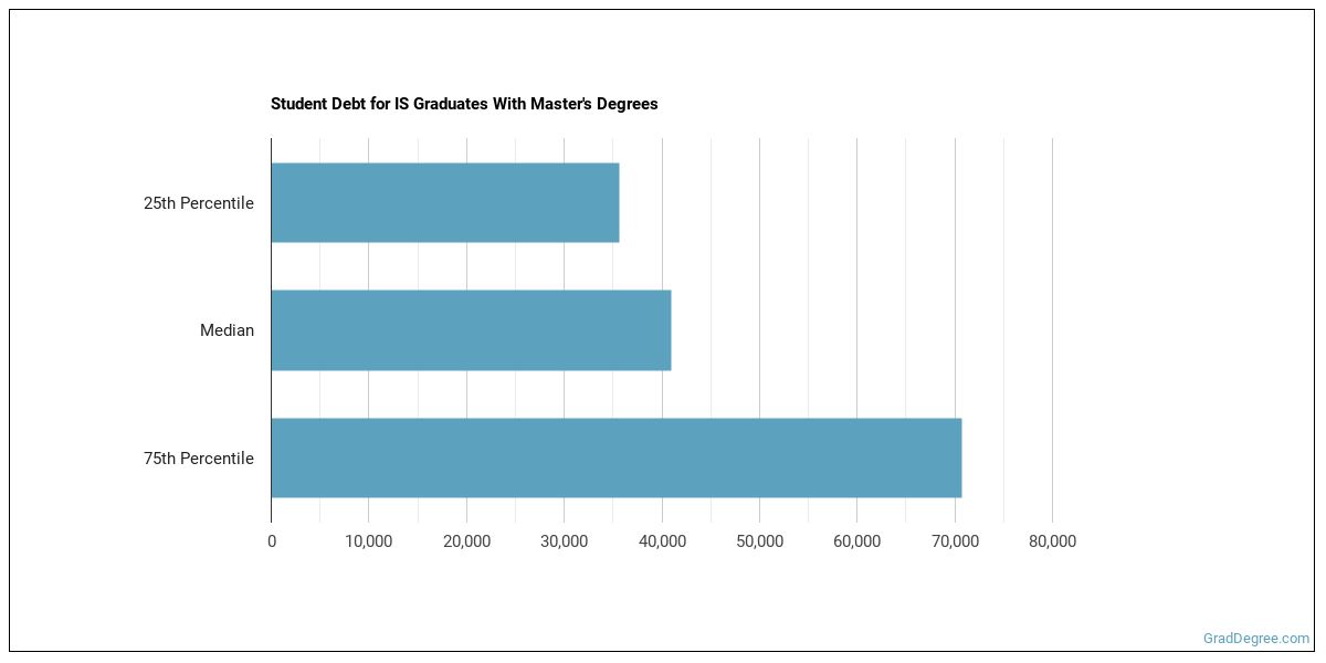 The median student debt for graduates holding a master's degree in is is $43,562. The school you go to and how long it takes you to graduate, among other things, can cause this number to vary. The chart below shows the range of accumulated debt loads. On the high side of the range, $74,156 is the debt load, and the debt load on the low side is $33,663.