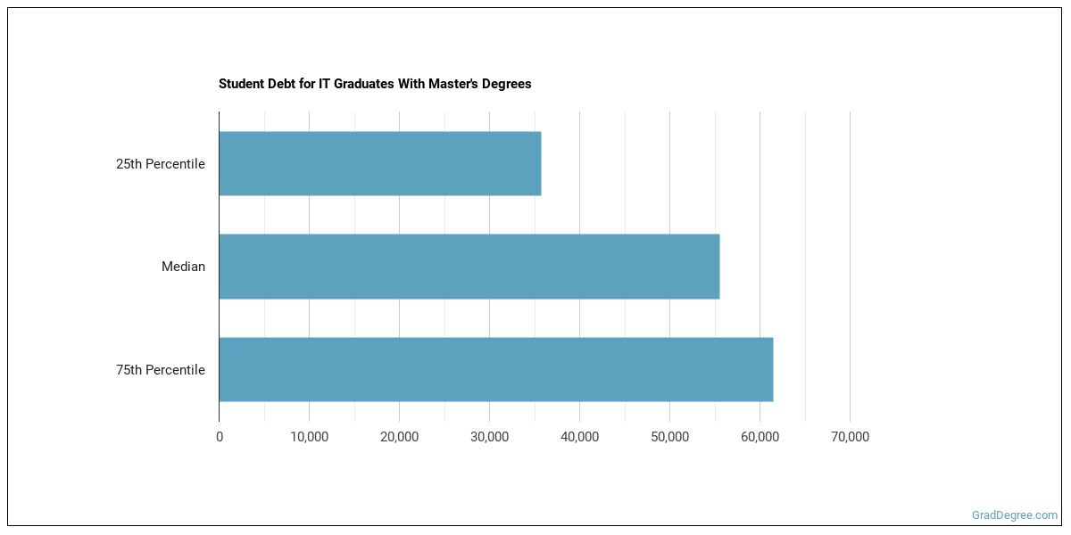 The median student debt for graduates holding a master's degree in it is $41,147. The length of time it takes you to graduate and what college you attend can affect this number quite a bit. The chart below shows the range of accumulated debt loads. On the high side of the range, $75,331 is the debt load, and the debt load on the low side is $35,633.