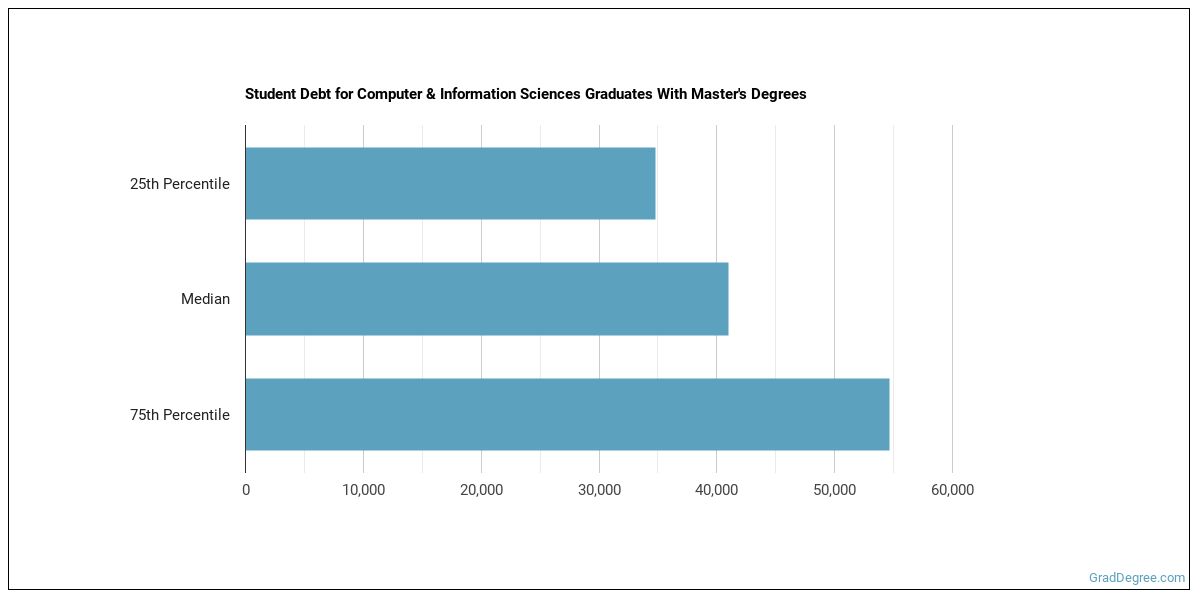 The median student debt for graduates holding a master's degree in computer & information sciences is $38,939. The length of time it takes you to graduate and what college you attend can affect this number quite a bit. The chart below shows the range of accumulated debt loads. On the high side of the range, $51,250 is the debt load, and the debt load on the low side is $32,654.
