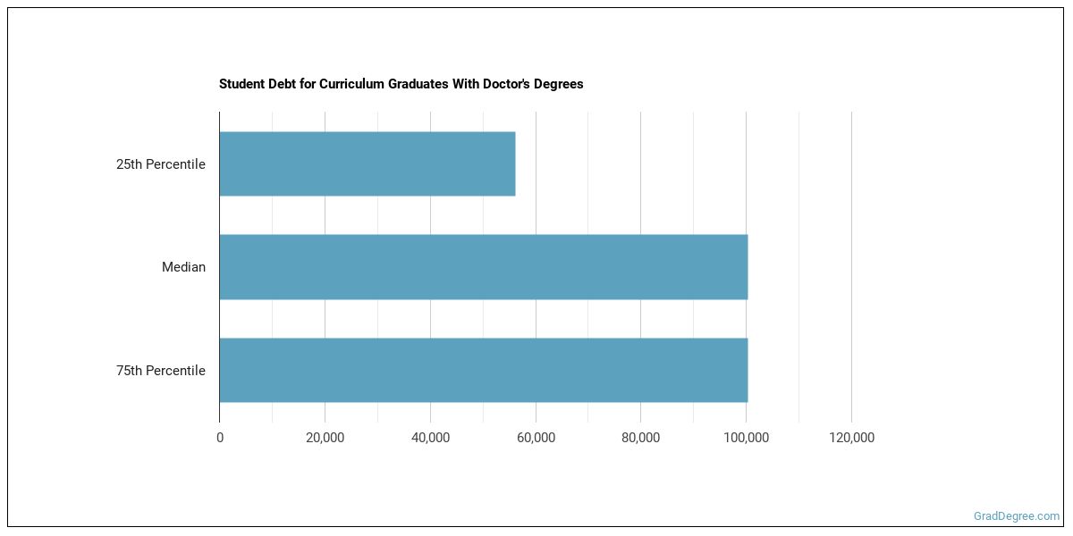 The median student debt for graduates holding a doctor's degree in curriculum is $55,692. The school you go to and how long it takes you to graduate, among other things, can cause this number to vary. The chart below shows the range of accumulated debt loads. On the high side of the range, $64,633 is the debt load, and the debt load on the low side is $46,008.