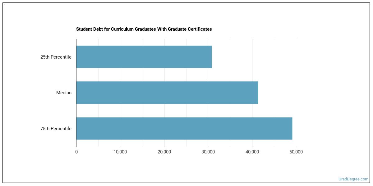 The median student debt for graduates holding a graduate certificate in curriculum is $48,563. The school you go to and how long it takes you to graduate, among other things, can cause this number to vary. The chart below shows the range of accumulated debt loads. On the high side of the range, $79,410 is the debt load, and the debt load on the low side is $29,758.