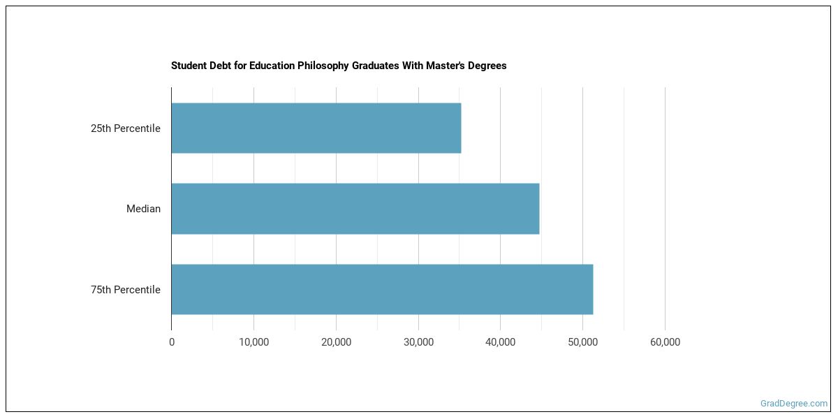 The median student debt for graduates holding a master's degree in education philosophy is $50,612. The school you go to and how long it takes you to graduate, among other things, can cause this number to vary. The chart below shows the range of accumulated debt loads. On the high side of the range, $57,765 is the debt load, and the debt load on the low side is $39,310.
