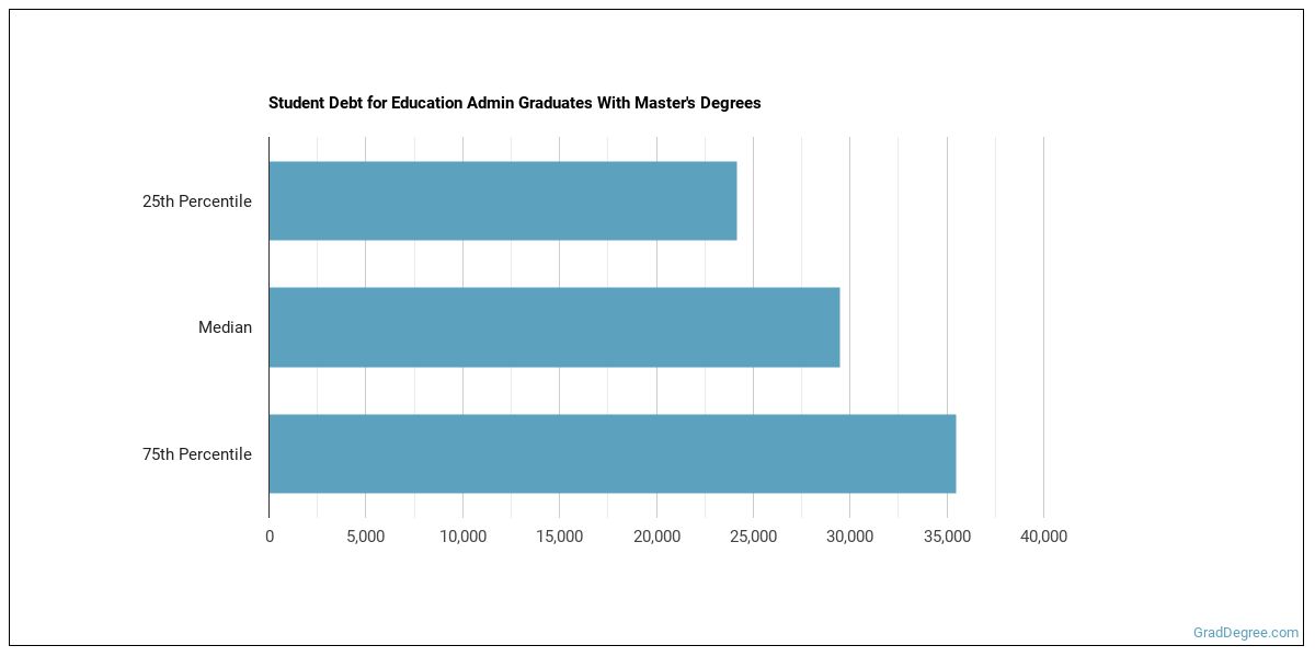 The median student debt for graduates holding a master's degree in education admin is $28,636. The school you go to and how long it takes you to graduate, among other things, can cause this number to vary. The chart below shows the range of accumulated debt loads. On the high side of the range, $35,800 is the debt load, and the debt load on the low side is $22,323.