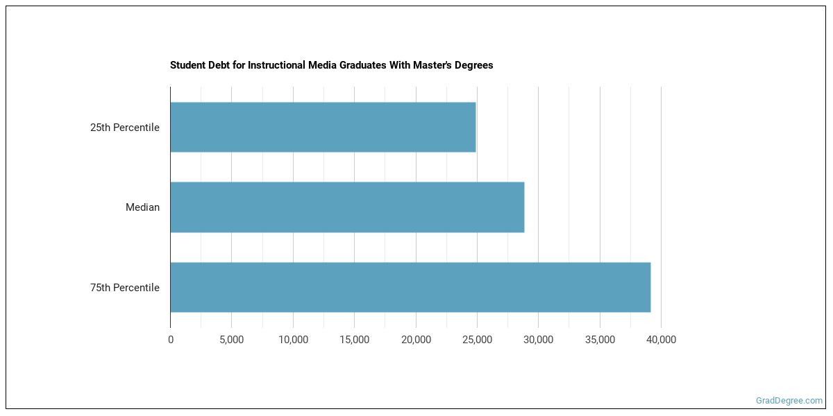 The median student debt for graduates holding a master's degree in instructional media is $24,840. The school you go to and how long it takes you to graduate, among other things, can cause this number to vary. The chart below shows the range of accumulated debt loads. On the high side of the range, $32,578 is the debt load, and the debt load on the low side is $20,500.
