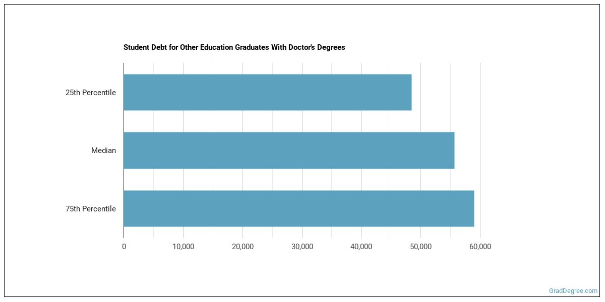 The median student debt for graduates holding a doctor's degree in other education is $75,186. The length of time it takes you to graduate and what college you attend can affect this number quite a bit. The chart below shows the range of accumulated debt loads. On the high side of the range, $79,797 is the debt load, and the debt load on the low side is $55,877.
