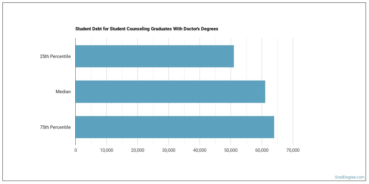 The median student debt for graduates holding a doctor's degree in student counseling is $57,628. The length of time it takes you to graduate and what college you attend can affect this number quite a bit. The chart below shows the range of accumulated debt loads. On the high side of the range, $117,409 is the debt load, and the debt load on the low side is $47,455.