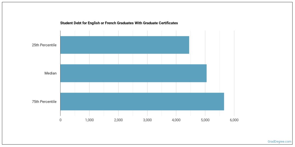 The median student debt for graduates holding a graduate certificate in english or french is $16,412. The school you go to and how long it takes you to graduate, among other things, can cause this number to vary. The chart below shows the range of accumulated debt loads. On the high side of the range, $18,379 is the debt load, and the debt load on the low side is $14,446.