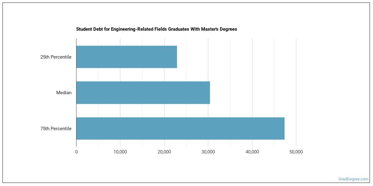 The median student debt for graduates holding a master's degree in engineering-related fields is $29,247. The length of time it takes you to graduate and what college you attend can affect this number quite a bit. The chart below shows the range of accumulated debt loads. On the high side of the range, $34,838 is the debt load, and the debt load on the low side is $23,225.