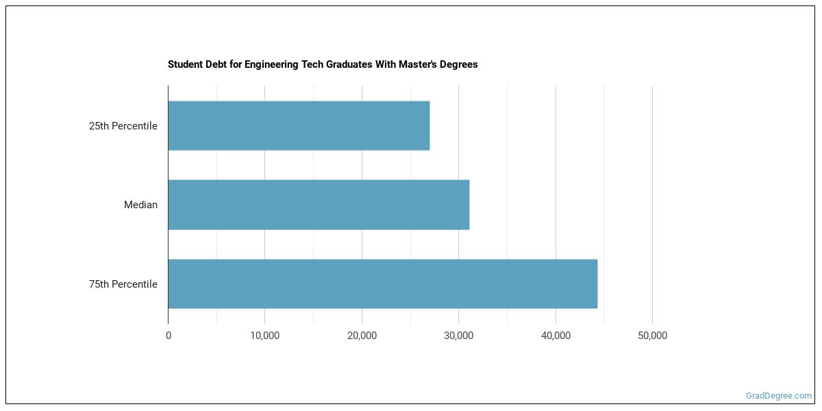 The median student debt for graduates holding a master's degree in engineering tech is $32,060. The length of time it takes you to graduate and what college you attend can affect this number quite a bit. The chart below shows the range of accumulated debt loads. On the high side of the range, $35,156 is the debt load, and the debt load on the low side is $26,820.