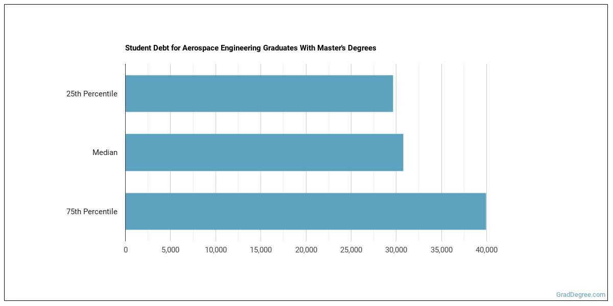 The median student debt for graduates holding a master's degree in aerospace engineering is $33,736. The school you go to and how long it takes you to graduate, among other things, can cause this number to vary. The chart below shows the range of accumulated debt loads. On the high side of the range, $39,382 is the debt load, and the debt load on the low side is $30,455.