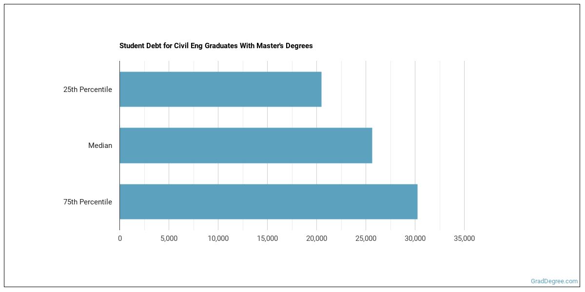 The median student debt for graduates holding a master's degree in civil eng is $21,044. The length of time it takes you to graduate and what college you attend can affect this number quite a bit. The chart below shows the range of accumulated debt loads. On the high side of the range, $30,820 is the debt load, and the debt load on the low side is $20,046.