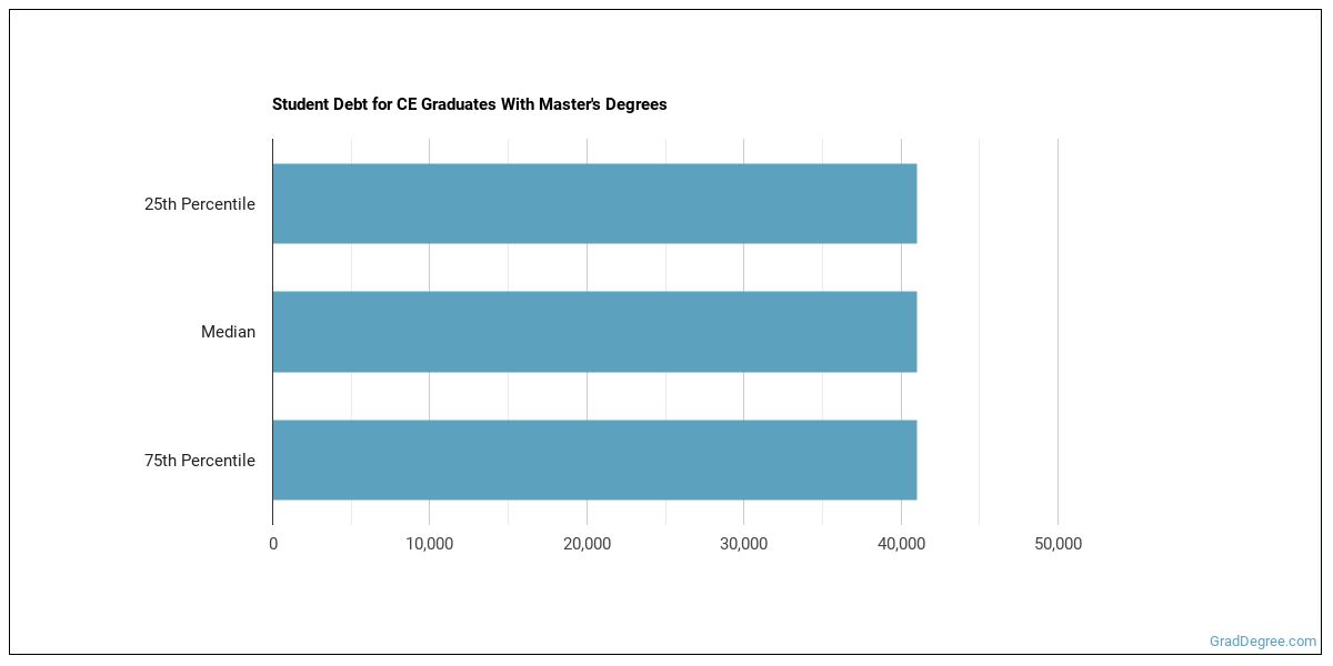 The median student debt for graduates holding a master's degree in ce is $38,278. The length of time it takes you to graduate and what college you attend can affect this number quite a bit. The chart below shows the range of accumulated debt loads. On the high side of the range, $41,000 is the debt load, and the debt load on the low side is $32,275.