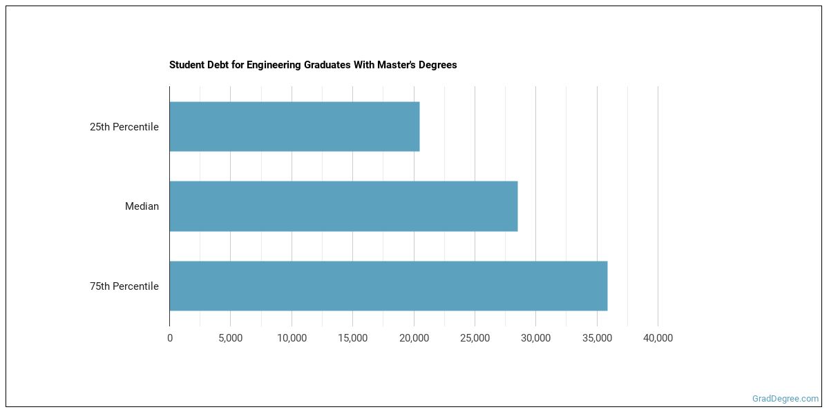 The median student debt for graduates holding a master's degree in engineering is $30,658. The school you go to and how long it takes you to graduate, among other things, can cause this number to vary. The chart below shows the range of accumulated debt loads. On the high side of the range, $37,238 is the debt load, and the debt load on the low side is $22,231.