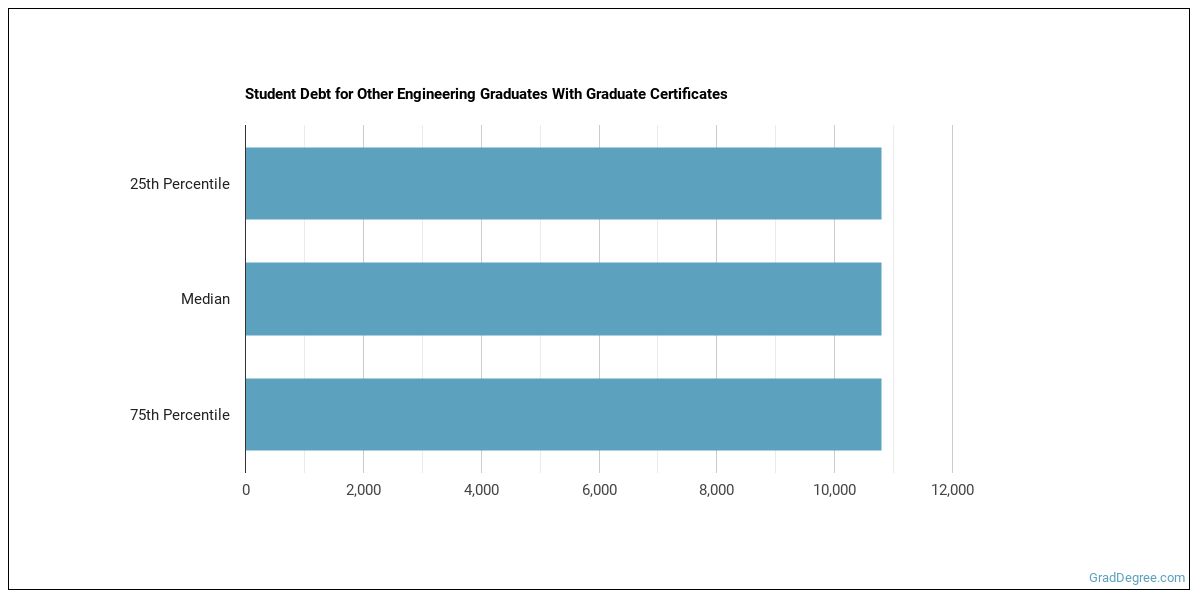 The median student debt for graduates holding a graduate certificate in other engineering is $137,056. The school you go to and how long it takes you to graduate, among other things, can cause this number to vary. The chart below shows the range of accumulated debt loads. On the high side of the range, $137,056 is the debt load, and the debt load on the low side is $137,056.
