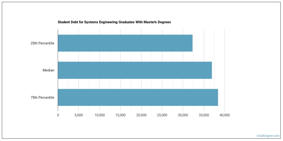 The median student debt for graduates holding a master's degree in systems engineering is $32,822. The length of time it takes you to graduate and what college you attend can affect this number quite a bit. The chart below shows the range of accumulated debt loads. On the high side of the range, $35,961 is the debt load, and the debt load on the low side is $32,822.