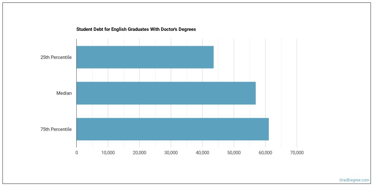 The median student debt for graduates holding a doctor's degree in english is $57,997. The length of time it takes you to graduate and what college you attend can affect this number quite a bit. The chart below shows the range of accumulated debt loads. On the high side of the range, $68,007 is the debt load, and the debt load on the low side is $54,322.