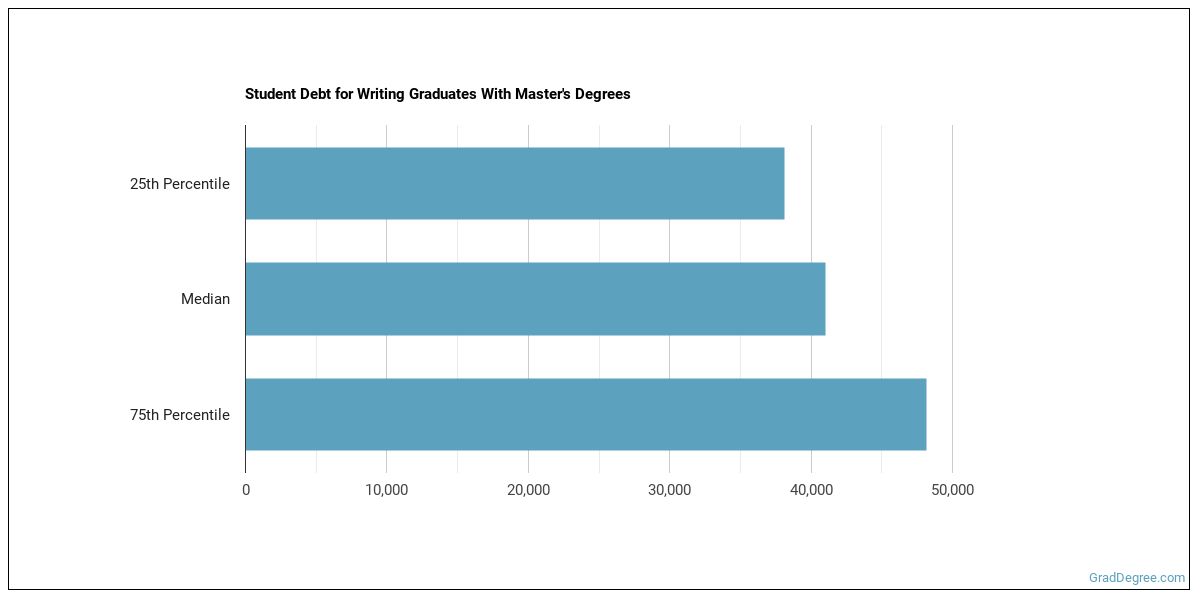 The median student debt for graduates holding a master's degree in writing is $41,000. The length of time it takes you to graduate and what college you attend can affect this number quite a bit. The chart below shows the range of accumulated debt loads. On the high side of the range, $48,027 is the debt load, and the debt load on the low side is $37,421.