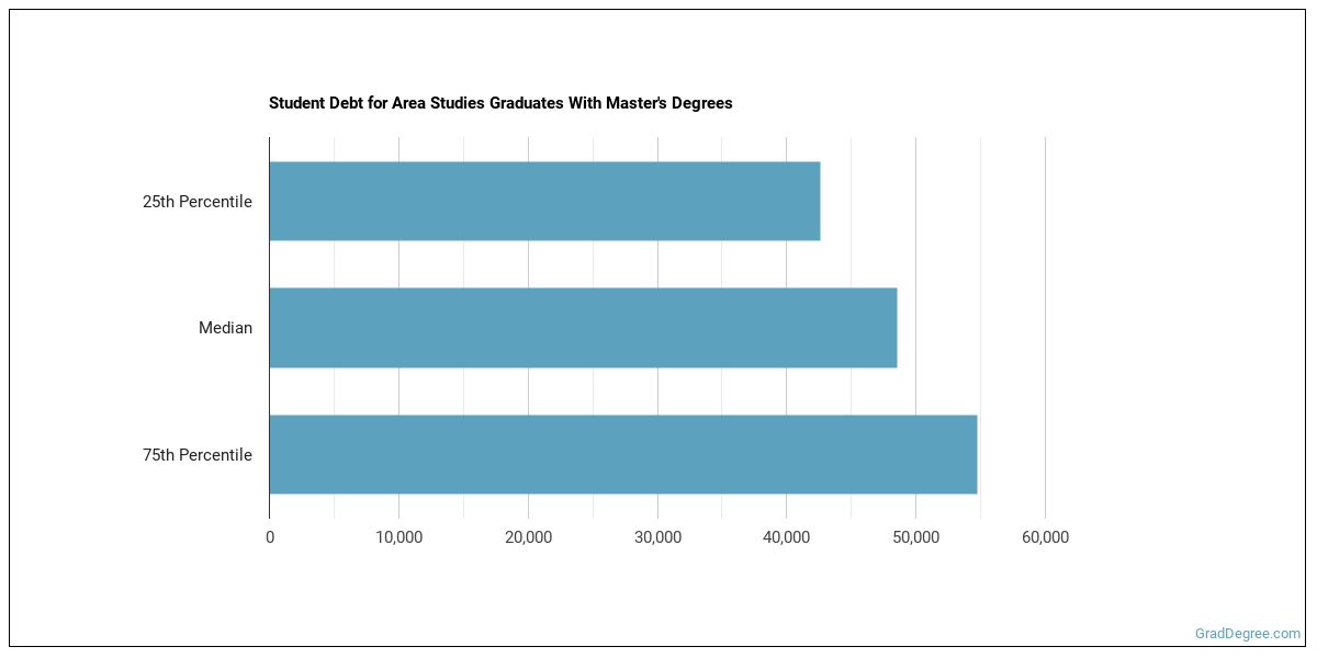 The median student debt for graduates holding a master's degree in area studies is $49,456. The length of time it takes you to graduate and what college you attend can affect this number quite a bit. The chart below shows the range of accumulated debt loads. On the high side of the range, $59,221 is the debt load, and the debt load on the low side is $37,846.