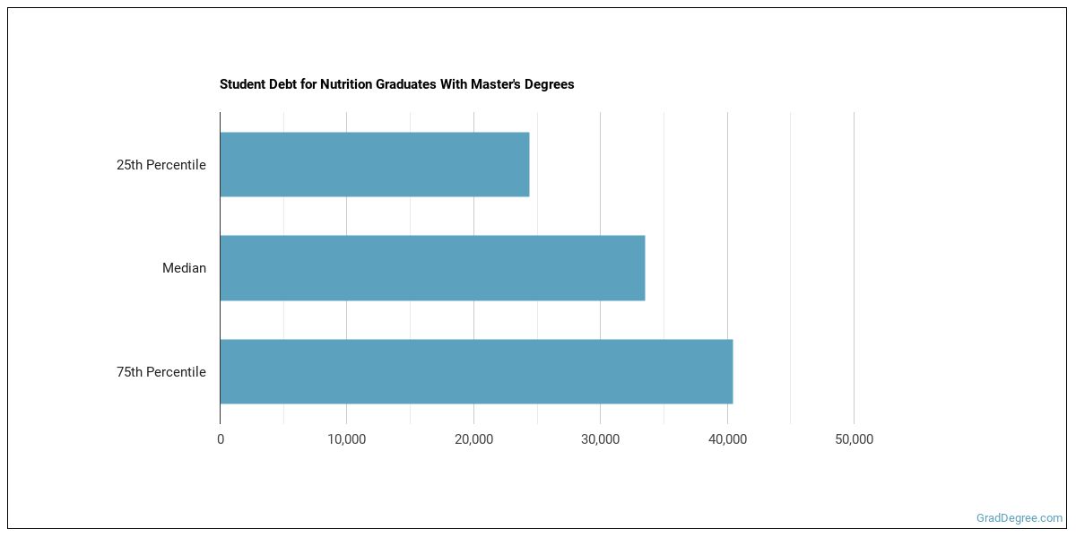 The median student debt for graduates holding a master's degree in nutrition is $33,998. The school you go to and how long it takes you to graduate, among other things, can cause this number to vary. The chart below shows the range of accumulated debt loads. On the high side of the range, $40,484 is the debt load, and the debt load on the low side is $29,120.