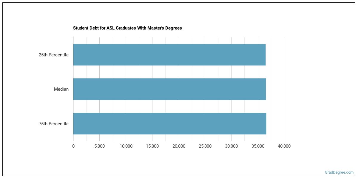 The median student debt for graduates holding a master's degree in asl is $28,535. The school you go to and how long it takes you to graduate, among other things, can cause this number to vary. The chart below shows the range of accumulated debt loads. On the high side of the range, $29,002 is the debt load, and the debt load on the low side is $28,067.