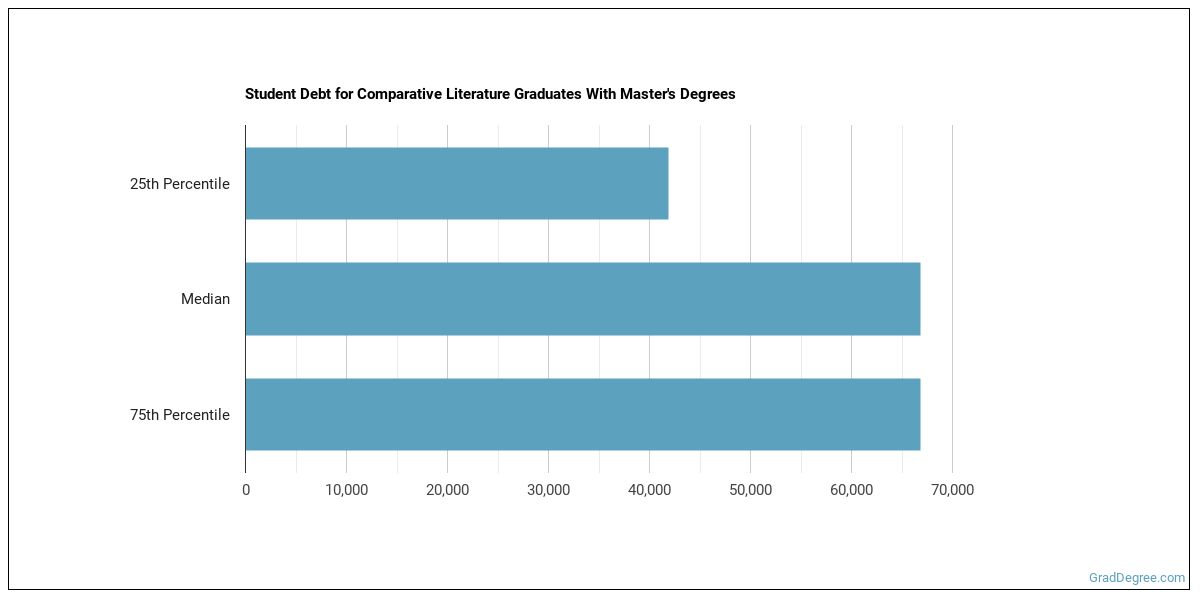 The median student debt for graduates holding a master's degree in comparative literature is $76,938. The school you go to and how long it takes you to graduate, among other things, can cause this number to vary. The chart below shows the range of accumulated debt loads. On the high side of the range, $76,938 is the debt load, and the debt load on the low side is $48,719.