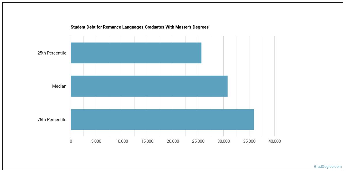 The median student debt for graduates holding a master's degree in romance languages is $17,995. The length of time it takes you to graduate and what college you attend can affect this number quite a bit. The chart below shows the range of accumulated debt loads. On the high side of the range, $17,995 is the debt load, and the debt load on the low side is $17,995.