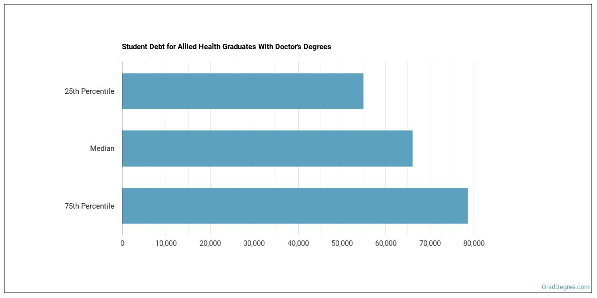 The median student debt for graduates holding a doctor's degree in allied health is $54,881. The school you go to and how long it takes you to graduate, among other things, can cause this number to vary. The chart below shows the range of accumulated debt loads. On the high side of the range, $95,980 is the debt load, and the debt load on the low side is $49,495.