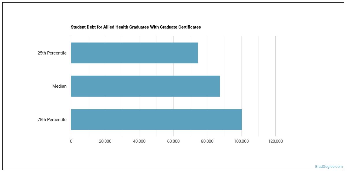The median student debt for graduates holding a graduate certificate in allied health is $100,145. The school you go to and how long it takes you to graduate, among other things, can cause this number to vary. The chart below shows the range of accumulated debt loads. On the high side of the range, $121,902 is the debt load, and the debt load on the low side is $78,486.