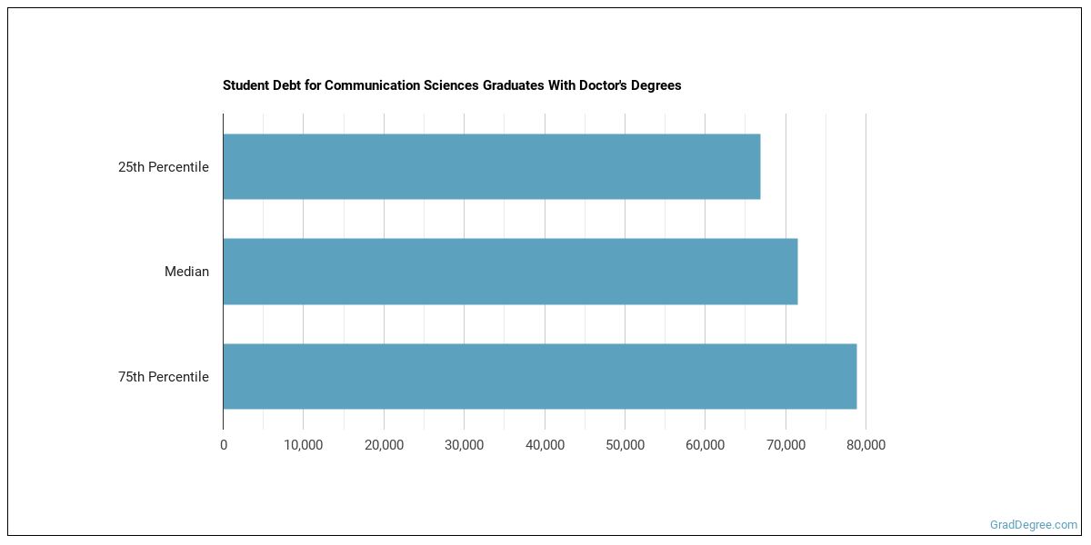 The median student debt for graduates holding a doctor's degree in communication sciences is $106,100. The school you go to and how long it takes you to graduate, among other things, can cause this number to vary. The chart below shows the range of accumulated debt loads. On the high side of the range, $137,833 is the debt load, and the debt load on the low side is $63,500.