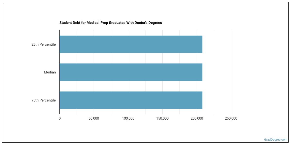 The median student debt for graduates holding a doctor's degree in medical prep is $221,398. The school you go to and how long it takes you to graduate, among other things, can cause this number to vary. The chart below shows the range of accumulated debt loads. On the high side of the range, $221,398 is the debt load, and the debt load on the low side is $221,398.