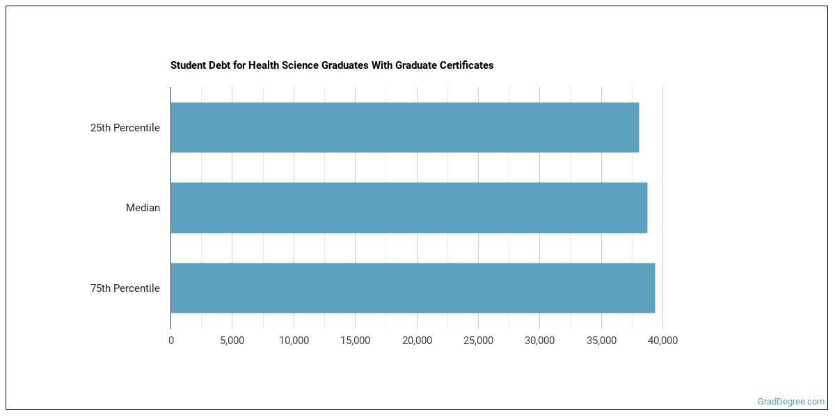The median student debt for graduates holding a graduate certificate in health science is $41,000. The school you go to and how long it takes you to graduate, among other things, can cause this number to vary. The chart below shows the range of accumulated debt loads. On the high side of the range, $41,000 is the debt load, and the debt load on the low side is $41,000.