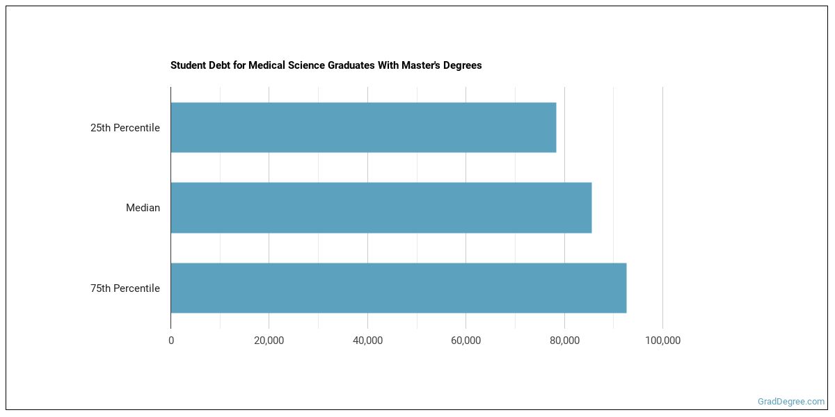 The median student debt for graduates holding a master's degree in medical science is $74,543. The school you go to and how long it takes you to graduate, among other things, can cause this number to vary. The chart below shows the range of accumulated debt loads. On the high side of the range, $81,514 is the debt load, and the debt load on the low side is $66,276.