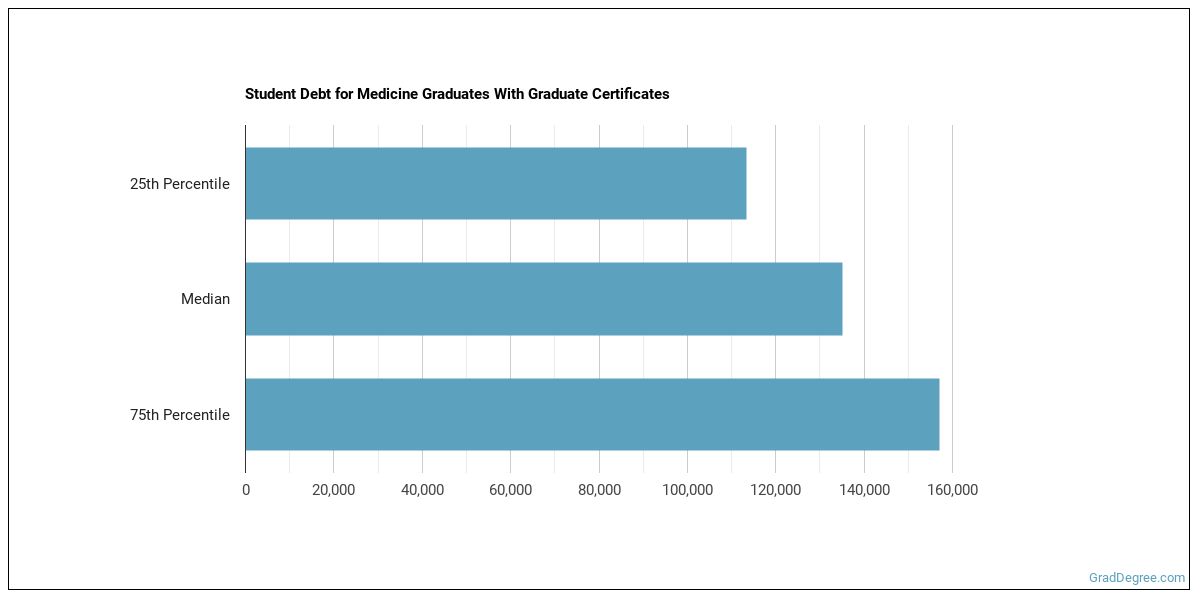 The median student debt for graduates holding a graduate certificate in medicine is $180,177. The school you go to and how long it takes you to graduate, among other things, can cause this number to vary. The chart below shows the range of accumulated debt loads. On the high side of the range, $181,377 is the debt load, and the debt load on the low side is $178,978.