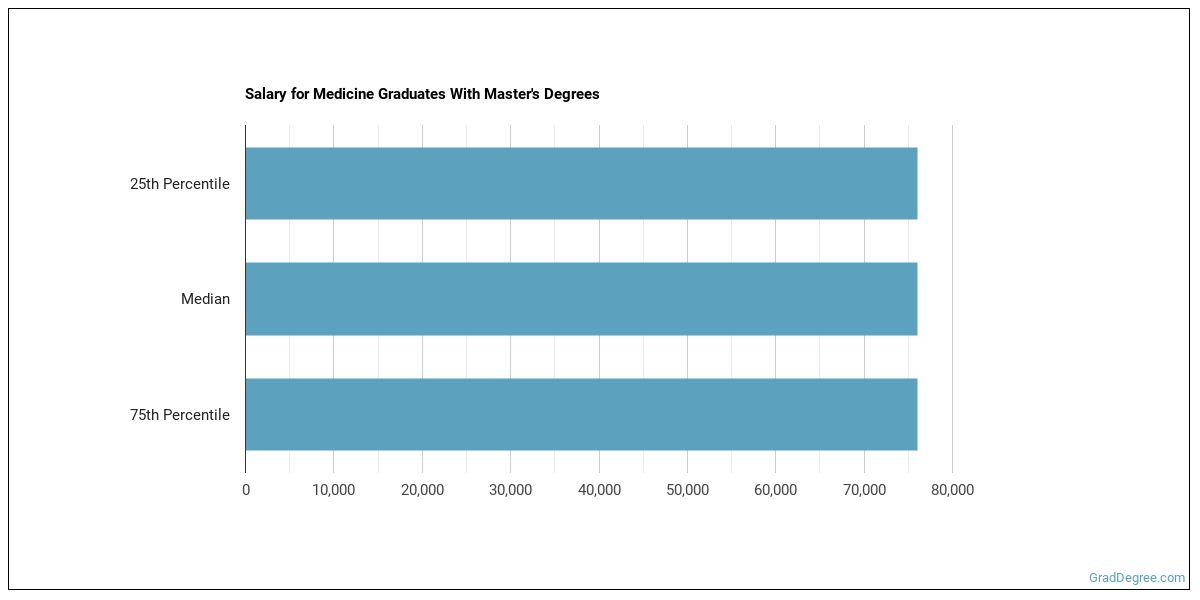 The median salary for graduates holding a master's degree in medicine is $76,084. A lot of factors can contribute to this number, such as the location of your workplace and the availability of other perks and bonuses. To get a better picture, earnings for this category of people can range from a low of $76,084 to a high of $76,084.