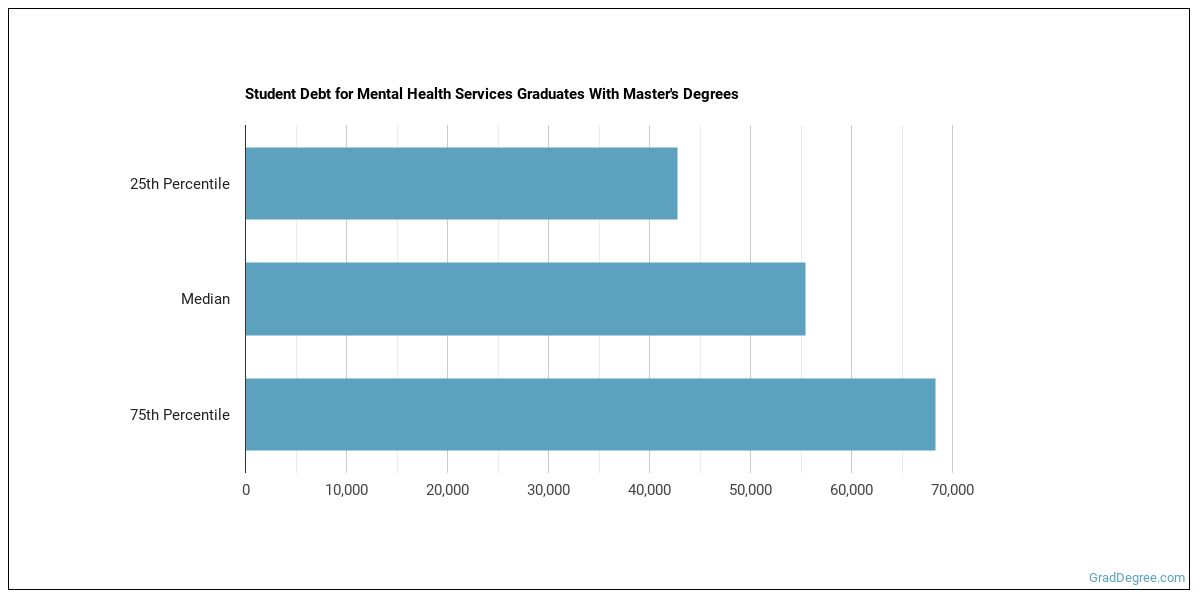 The median student debt for graduates holding a master's degree in mental health services is $53,045. The school you go to and how long it takes you to graduate, among other things, can cause this number to vary. The chart below shows the range of accumulated debt loads. On the high side of the range, $62,455 is the debt load, and the debt load on the low side is $41,210.