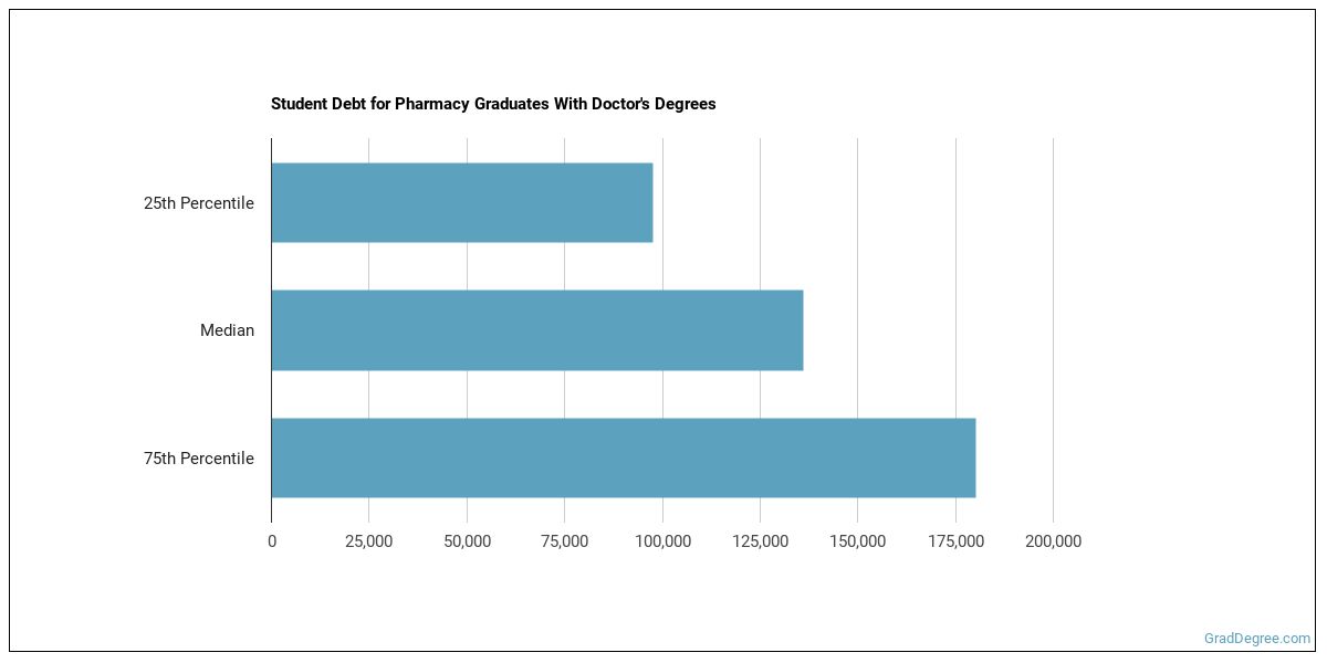 The median student debt for graduates holding a doctor's degree in pharmacy is $145,667. The length of time it takes you to graduate and what college you attend can affect this number quite a bit. The chart below shows the range of accumulated debt loads. On the high side of the range, $212,484 is the debt load, and the debt load on the low side is $117,691.