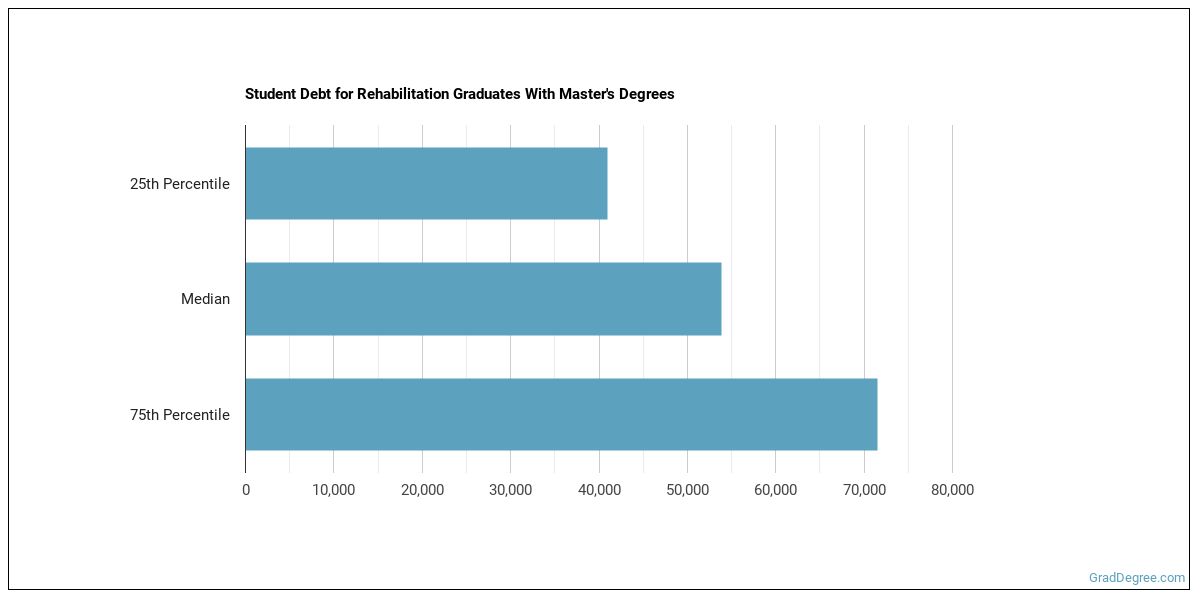 The median student debt for graduates holding a master's degree in rehabilitation is $57,000. The length of time it takes you to graduate and what college you attend can affect this number quite a bit. The chart below shows the range of accumulated debt loads. On the high side of the range, $75,495 is the debt load, and the debt load on the low side is $41,000.