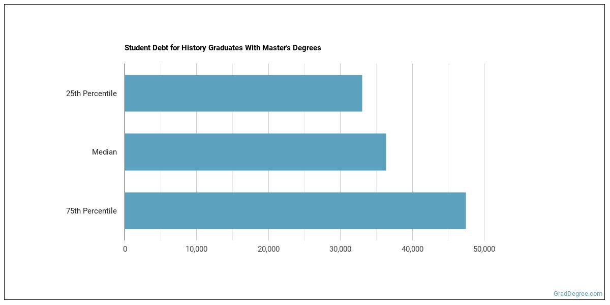 The median student debt for graduates holding a master's degree in history is $40,538. The school you go to and how long it takes you to graduate, among other things, can cause this number to vary. The chart below shows the range of accumulated debt loads. On the high side of the range, $40,831 is the debt load, and the debt load on the low side is $30,975.