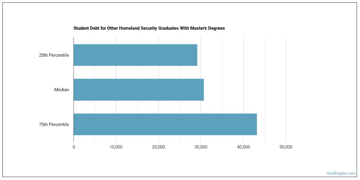 The median student debt for graduates holding a master's degree in other homeland security is $30,683. The school you go to and how long it takes you to graduate, among other things, can cause this number to vary. The chart below shows the range of accumulated debt loads. On the high side of the range, $31,378 is the debt load, and the debt load on the low side is $29,550.