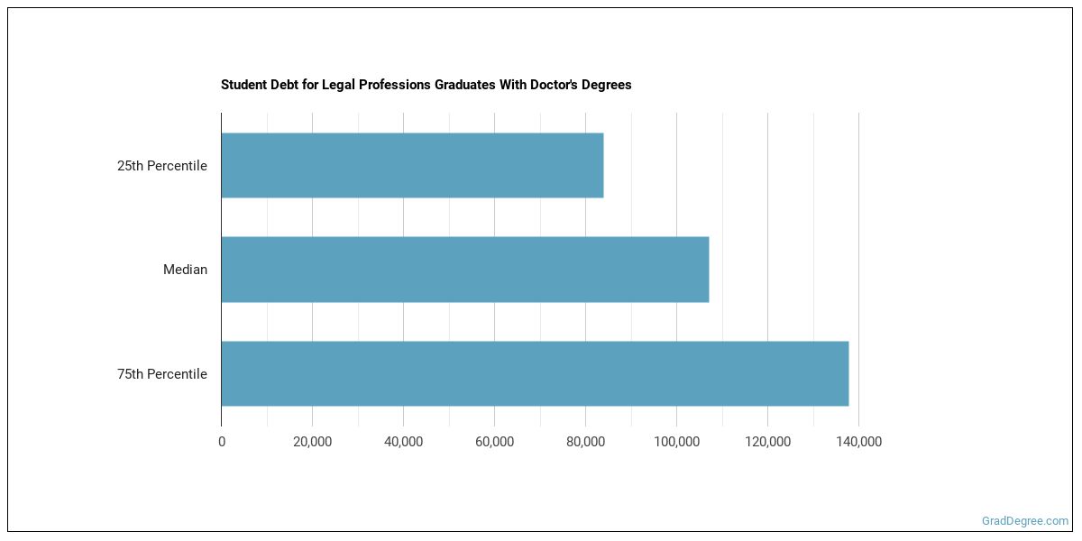 The median student debt for graduates holding a doctor's degree in legal professions is $106,377. The school you go to and how long it takes you to graduate, among other things, can cause this number to vary. The chart below shows the range of accumulated debt loads. On the high side of the range, $143,779 is the debt load, and the debt load on the low side is $83,256.