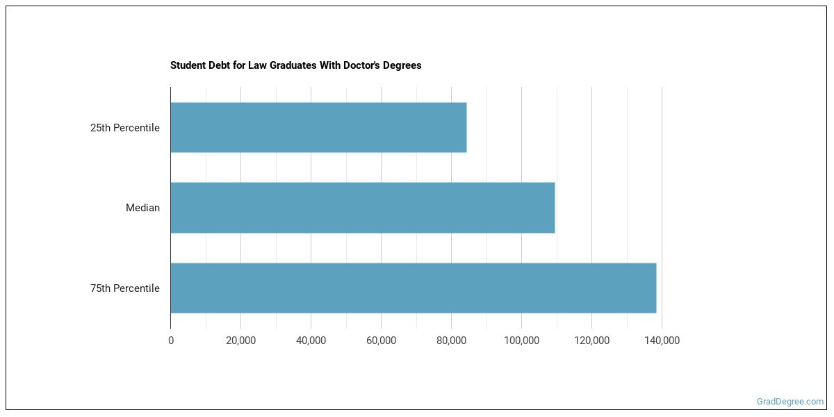 The median student debt for graduates holding a doctor's degree in law is $108,228. The school you go to and how long it takes you to graduate, among other things, can cause this number to vary. The chart below shows the range of accumulated debt loads. On the high side of the range, $143,299 is the debt load, and the debt load on the low side is $85,950.
