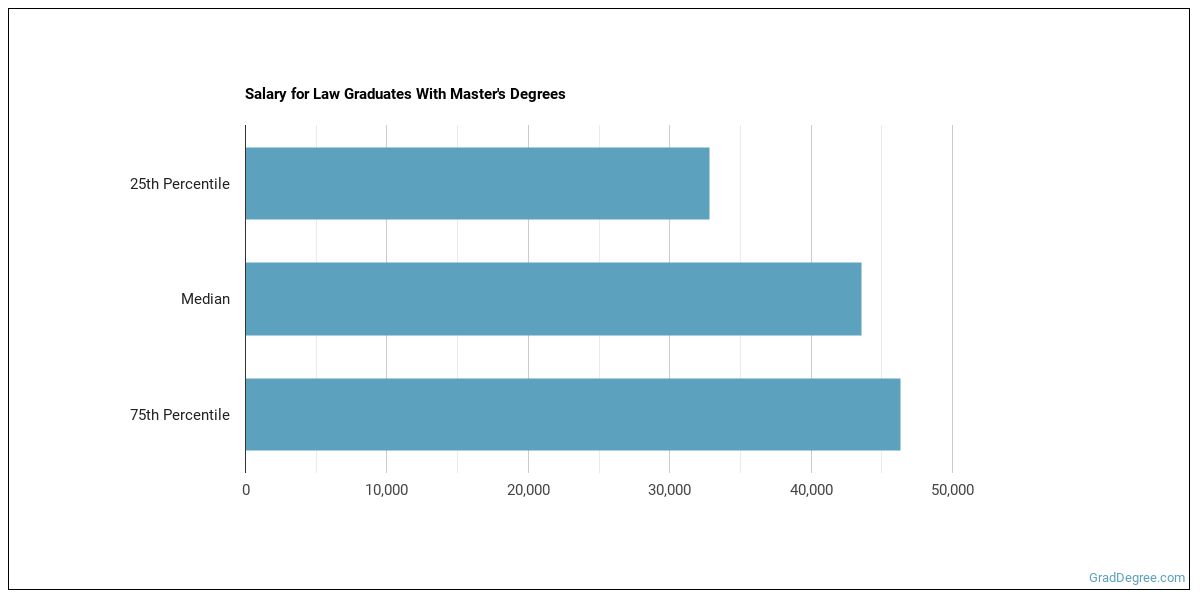 The median salary for graduates holding a master's degree in law is $43,574. A lot of factors can contribute to this number, such as the location of your workplace and the availability of other perks and bonuses. A better approximation of salary is to look at the typical range of salaries. In this case the low is $32,844 and the high is $46,326.