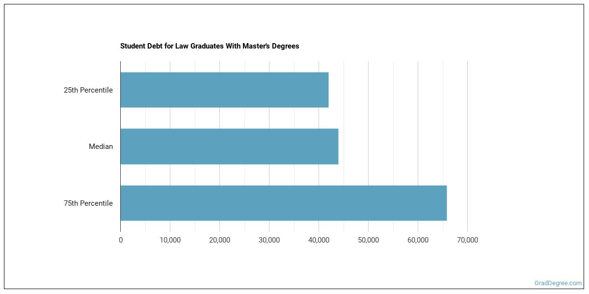 The median student debt for graduates holding a master's degree in law is $50,500. The school you go to and how long it takes you to graduate, among other things, can cause this number to vary. The chart below shows the range of accumulated debt loads. On the high side of the range, $66,097 is the debt load, and the debt load on the low side is $49,426.