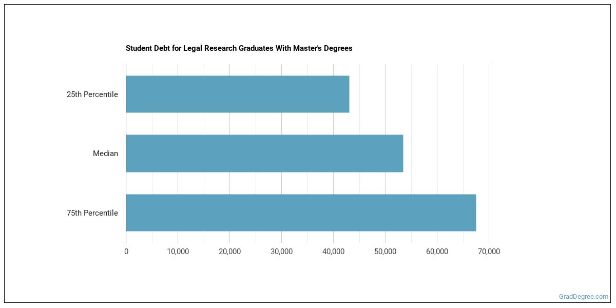 The median student debt for graduates holding a master's degree in legal research is $54,664. The school you go to and how long it takes you to graduate, among other things, can cause this number to vary. The chart below shows the range of accumulated debt loads. On the high side of the range, $66,790 is the debt load, and the debt load on the low side is $45,899.