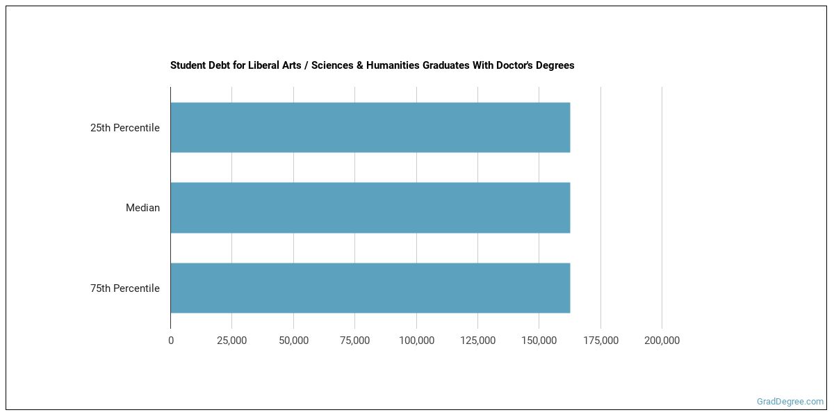 The median student debt for graduates holding a doctor's degree in liberal arts / sciences & humanities is $190,629. The school you go to and how long it takes you to graduate, among other things, can cause this number to vary. The chart below shows the range of accumulated debt loads. On the high side of the range, $190,629 is the debt load, and the debt load on the low side is $190,629.