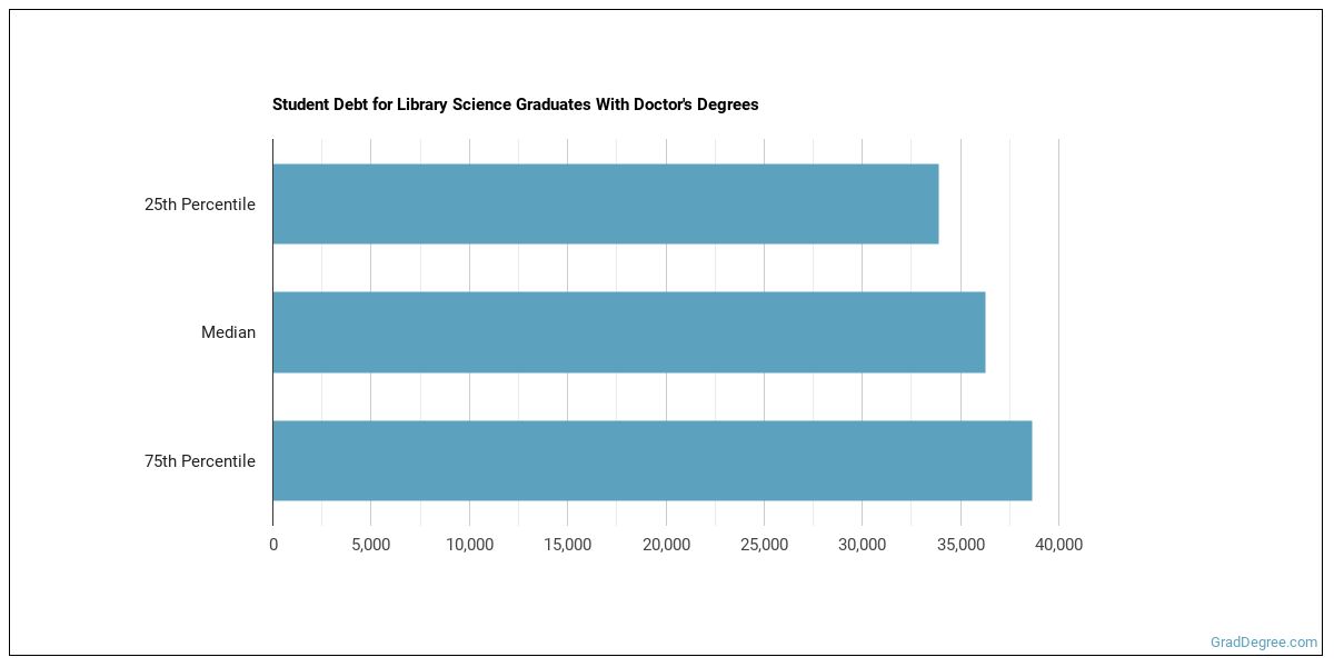 The median student debt for graduates holding a doctor's degree in library science is $41,000. The school you go to and how long it takes you to graduate, among other things, can cause this number to vary. The chart below shows the range of accumulated debt loads. On the high side of the range, $41,000 is the debt load, and the debt load on the low side is $41,000.